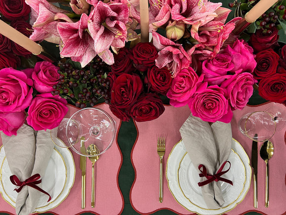 Dieses knallige, pink-rote Ensemble verwandelt jeden Tisch in ein florales Kunstwerk. Abgerundet mit goldenen Accessoires ein Farbstatement mit Wow-Effekt.
