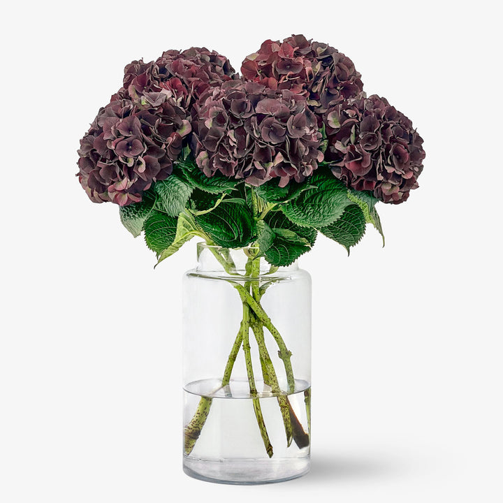 The reference image shows 5 hydrangeas in the 34 cm Signature Tom Flowers Glass Vase Medium.