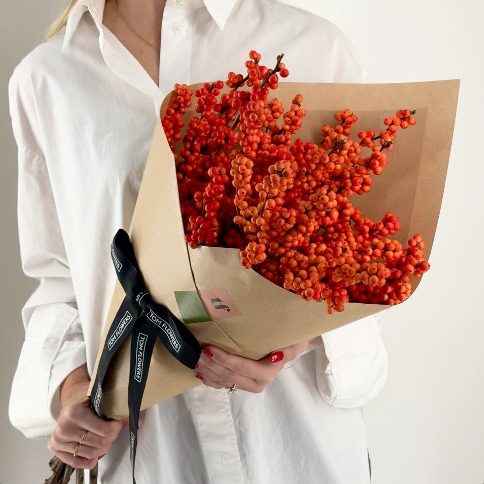 The reference image shows 5 red holly branches in the 34 cm high Tom Flowers Vase Medium.