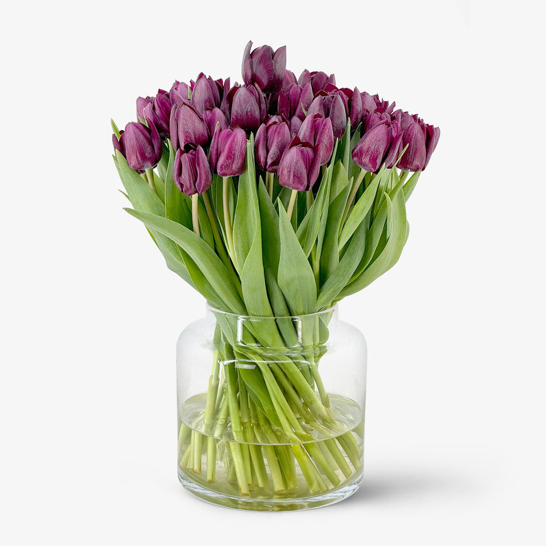 Das Referenzbild zeigt 50 klassische Tulpen in der 24 cm hohen Tom Flowers Small Vase.