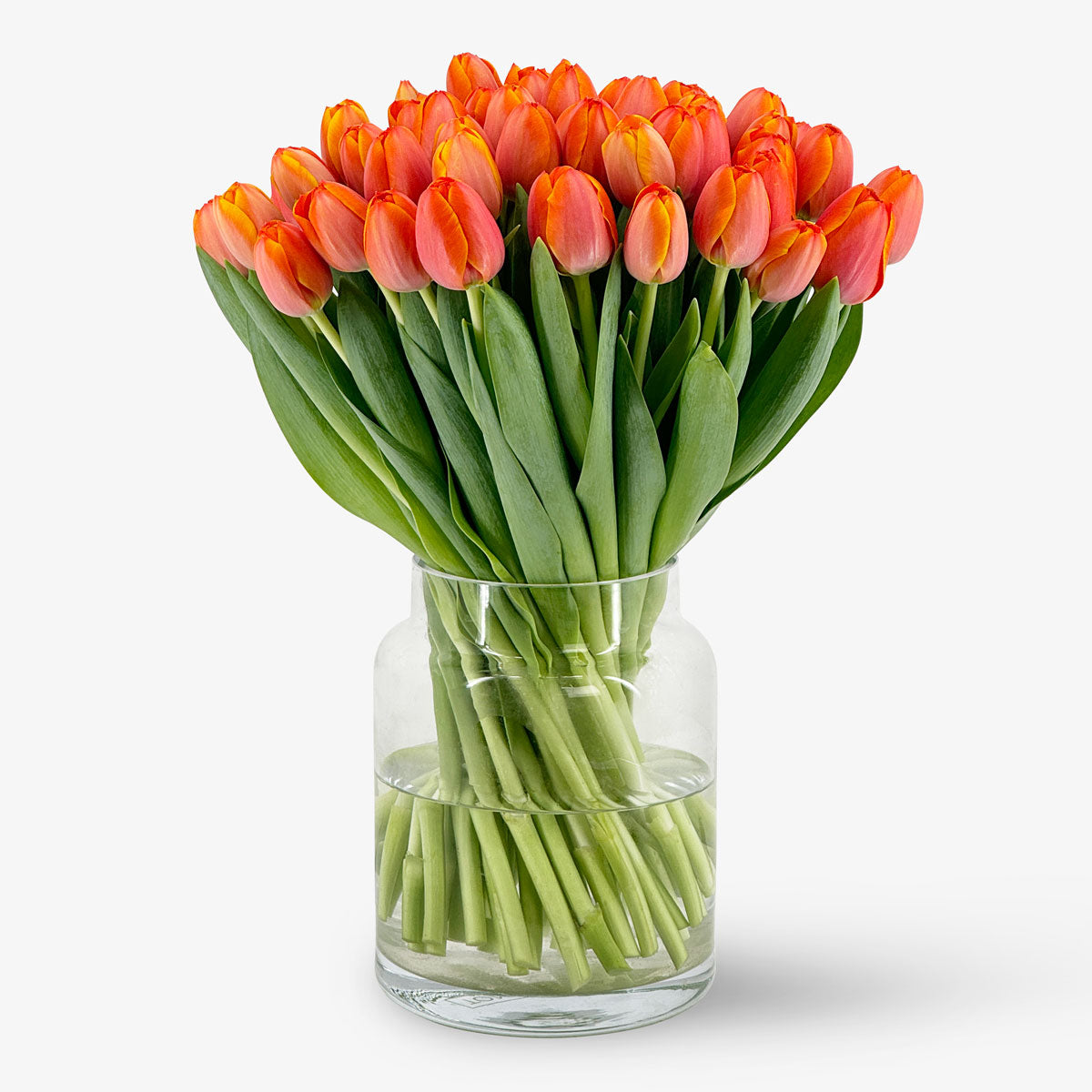 Das Referenzbild zeigt 50 klassische Tulpen orange in der 24 cm hohen Tom Flowers Small Vase.