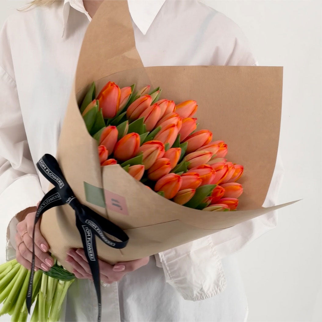 Das Video zeigt 50 klassische Tulpen orange in der Tom Flowers Signature Geschenkverpackung.