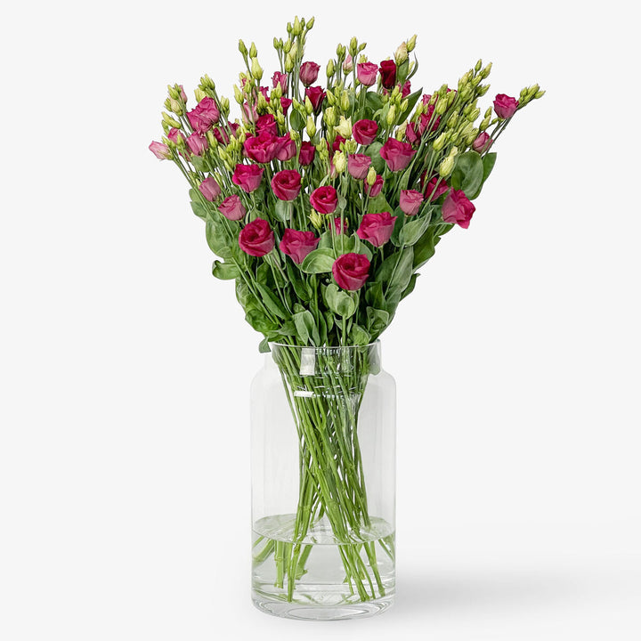 Das Referenzbild zeigt 10 Lisianthus Stiele in der 34 cm hohen Tom Flowers Vase Medium.