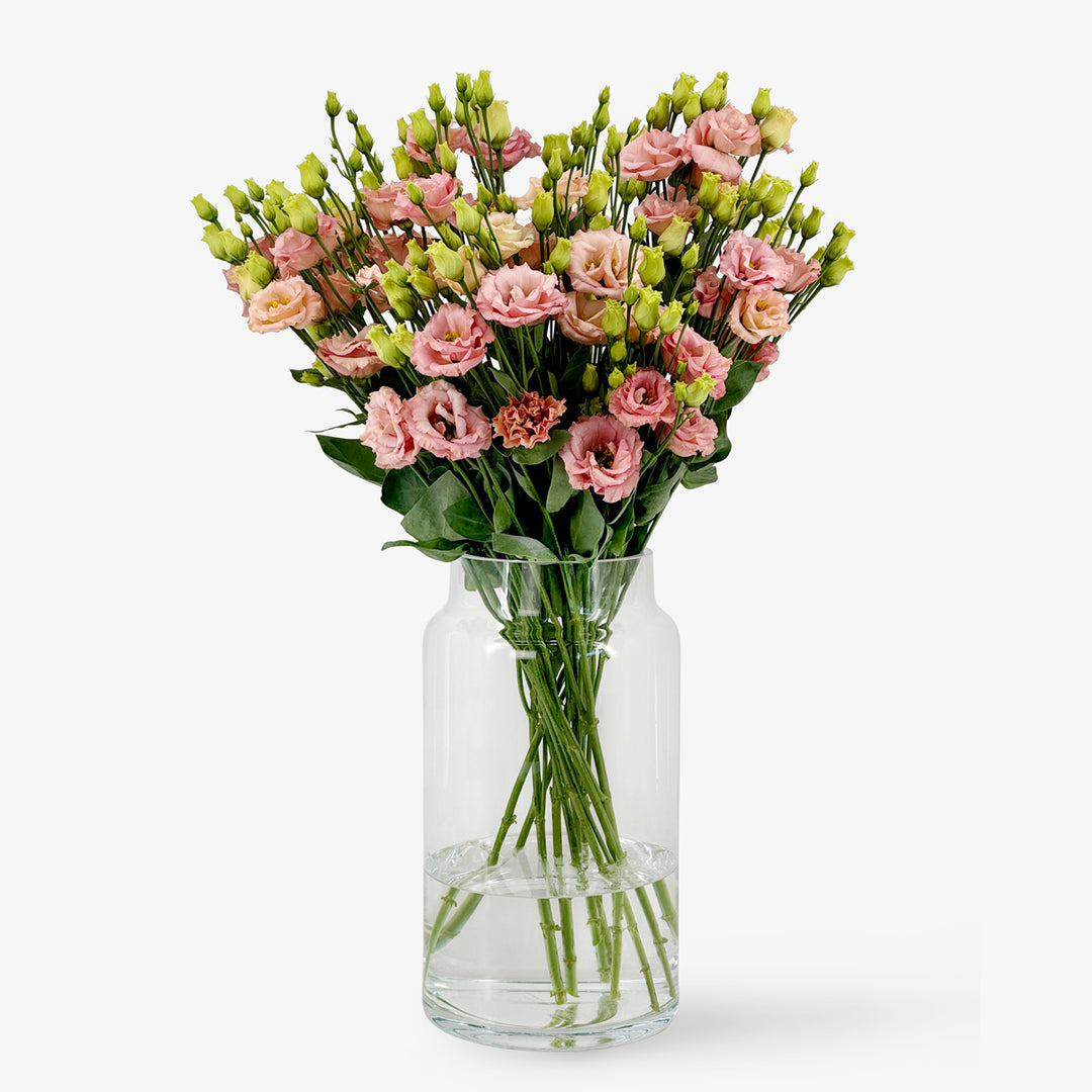Das Referenzbild zeigt 10 Lisianthus Stiele in der 34 cm hohen Tom Flowers Vase Medium.