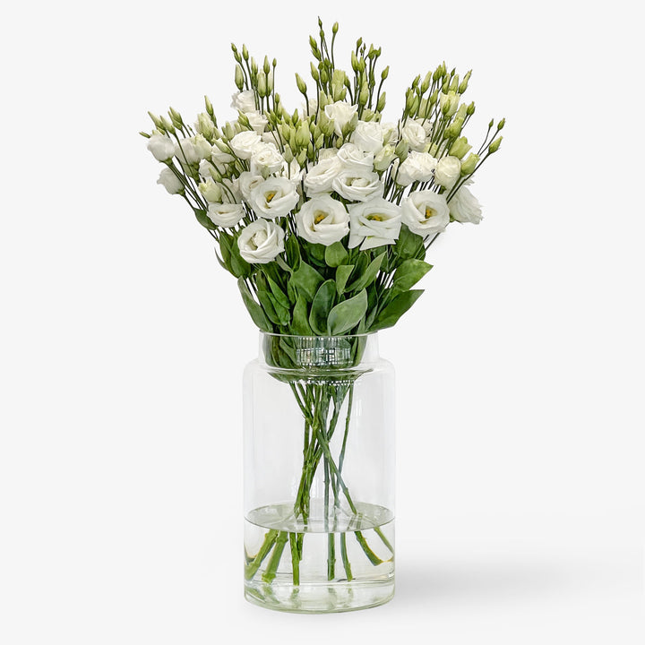 Das Referenzbild zeigt 10 Lisianthus Stiele in der 34 cm hohen Tom Flowers Vase Medium.